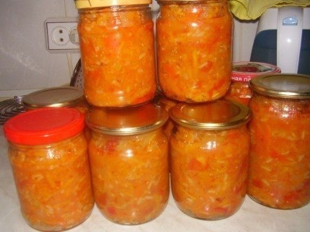 Ингредиенты: 🫙3 кг. спелых помидор 🫙1 кг. перца болгарского 🫙1 кг.репчатого лука 🫙1 кг. моркови 🫙1 стакан риса (250гр.гранённый) 🫙100 гр. сахара 🫙400гр. растит.масла 🫙уксус 9%-по вкусу 🫙Выход - 5,5 л. Всё режем произвольно, морковь трём на крупной тёрке, солим по вкусу, как салат и оставляем на 15 мин. Через 15 мин. доводим до кипения, добавляем рис, предварительно ошпарив его кипятком, сахар, раст. масло и даём покипеть 45 мин., добавляем уксус, я кладу от 2-х стол. ложек до 100гр., зависит от кислоты помидор. Через 5 мин. салат готов, выкладываем в стерилизованные банки, закрываем, укрываем одеялом до остывания. Если ваш рис не успел свариться за 45 мин., пусть ещё покипит мин. 10-15. Салат получается густой.