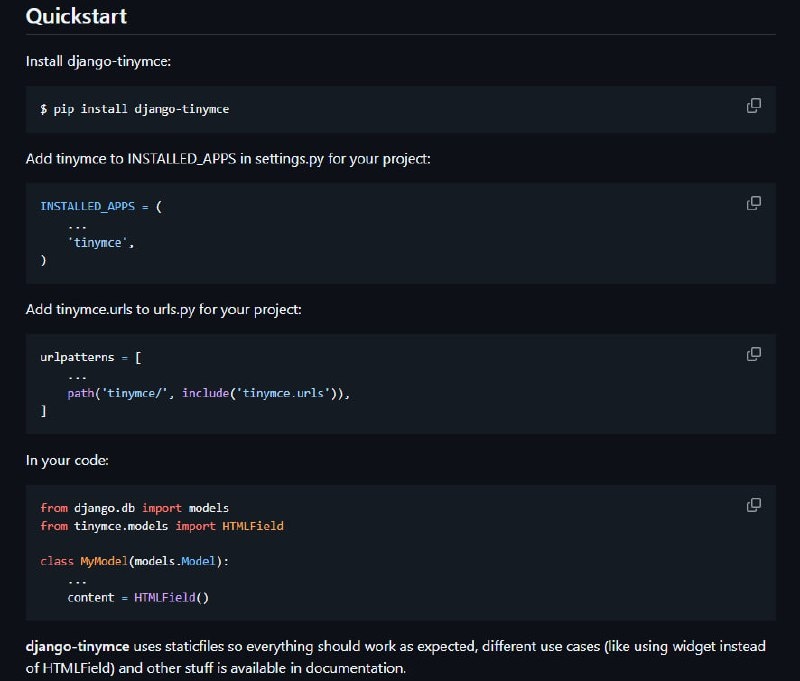 ✏️ django‑tinymce — это удобное Django‑приложение, которое предоставляет виджет на основе TinyMCE для редактирования HTML в полях форм и