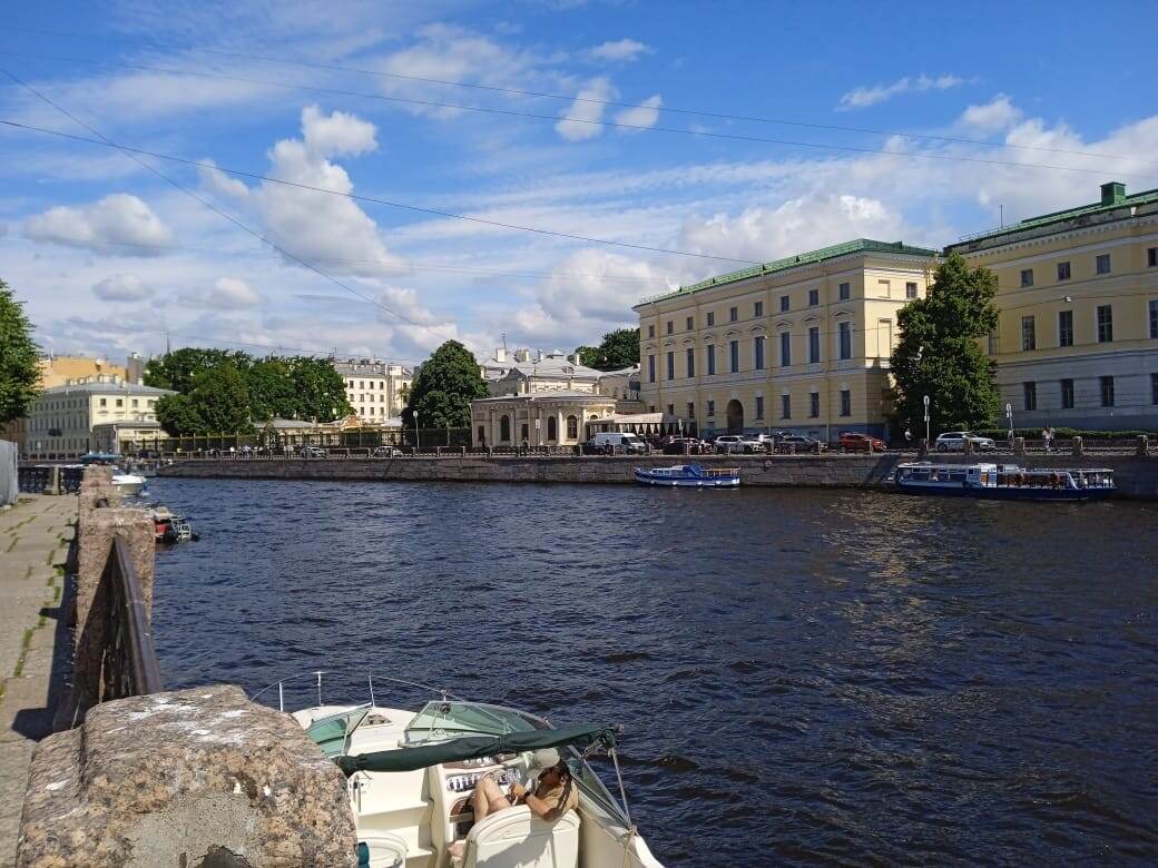Всем привет. Предварительные итоги моего похудения за месяц. Я начала худеть с 1 июня с веса 61 килограмм 300 граммов, и почти за месяц, до субботы 28 июня, я похудела на 1 килограмм 300 граммов. Ну что сказать по этому поводу? Я разочарована. Я рассчитывала похудеть за месяц как минимум на 3 кг, но никак не на один. Непонятно, почему так произошло. Видимо, я делаю что-то не так. Хотя в дневной калораж я всегда укладывалась, иногда было даже чуть меньше 1200 калорий. Продолжу рассказывать про пятничную прогулку. Из музея «Русский Левша» по Итальянской улице я дошла до набережной Фонтанки. На той стороне реки в деревьях спрятался Шереметевский дворец. Немножко погуляла по набережной и направилась к Аничкову дворцу. Мне хотелось посмотреть, какие цветы растут в парке Аничкова дворца. Перед дворцом разбита клумба с красными цветами, а раньше на этом месте цвели красные тюльпаны. Я показывала фотографию, а вокруг клумбы цветут шикарные пионы. Видно, что некоторые цветы, котор