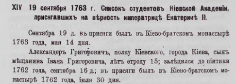 "...в присяге был в Киево-братском монастыре 1763 года, мая 14 дня. Александер Григорович, полку Киевского, города Киева, сын мещанина Ивана Григоровича, лет от роду 15; залецился до пиитики (поступил в класс пиитики) 1762 года, июля 30 дня" [6].