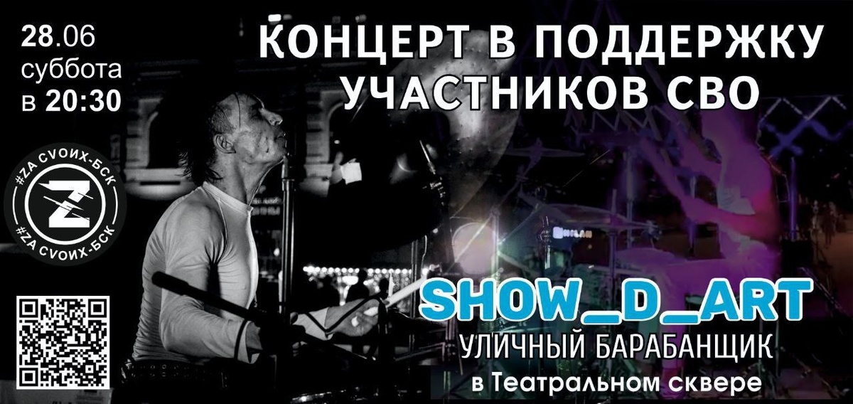 Приглашаем на уникальный концерт в поддержку участников СВО! 🎶 📅 Дата: 28 июня 🕣 Время: 20:30 📍 Место: сцена за драмтеатром Мы рады анонсировать незабываемый вечер с талантливым уличным барабанщиком Show_d_Art! Музыкант, который покоряет сердца своим драйвом и талантом! 🥁 Приходите сами и зовите друзей! Будет жарко! 🔥 Все собранные средства пойдут на поддержку наших ребят!
