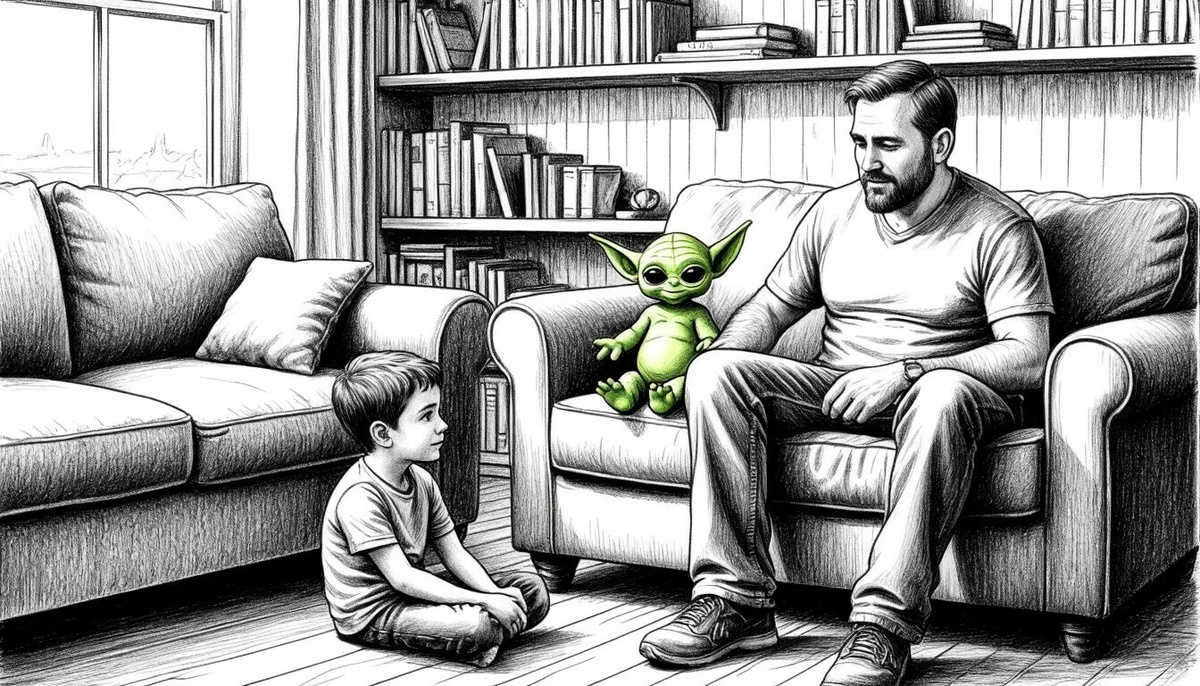 "Визитер" обернулся. Увидел предмет в руке сына. Замер. Я зафиксировал классические признаки стресса у взрослого оператора: микроподергивание века, учащение дыхания, мгновенная попытка сглаживания ситуации (натянутая улыбка).