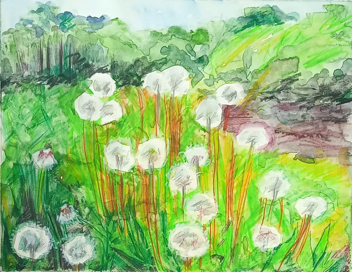 Полянка с одуванчиками Акварель, цветные карандаши #лето #одуванчики