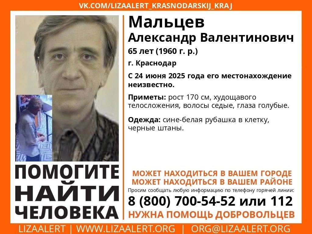 24 июня в Краснодаре пропал 75-летний Александр Владимирович Мальцев. Он вышел из дома и бесследно исчез. В последний раз камеры зафиксировали его в продуктовом магазине. Приметы: рост 170 см, худощавого телосложения, волосы седые, глаза голубые. В день пропажи он был одет в сине-белую рубашку в клетку, черные штаны. Добровольцы поисково-спасательного отряда «ЛизаАлерт» отмечают, что мужчина может находиться в любом городе Краснодарского края. Если вам что-либо известно о местонахождении Александра Владимировича, сообщите по номеру горячей линии отряда: 8(800)700-54-52. Его ждут родные дома.