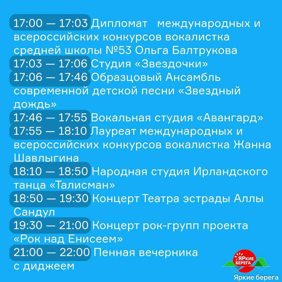 ▶️ День молодежи отпразднуют на Ярыгинской набережной Сегодня с 16:00 на сцене прозвучат лучшие хиты отечественной эстрады. В 18:10 выступит Театр эстрады Аллы Сандул, а сразу после — живая музыка от «Рока над Енисеем». А в 21:00 — пенная вечеринка с диджеем, сообщают в канале «Яркие берега».