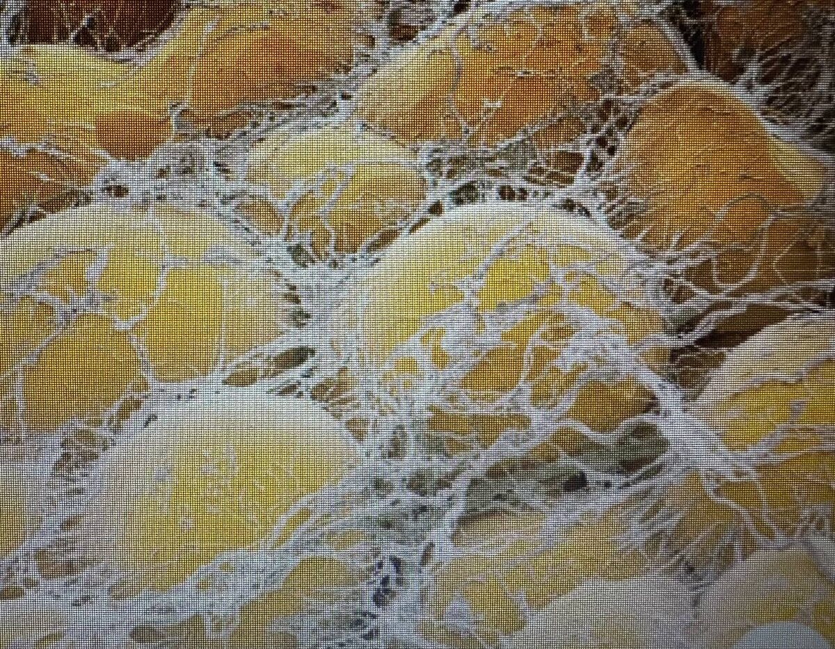 Жёлтые шары – это жировые клетки Белая паутина вокруг – это коллагеновые и эластиновые волокна, формирующие каркас кожи. Когда волокна теряют эластичность, становится жёсткими и неравномерно натягиваются – кожа «втягивается» между увеличенными клетками, создавая ту самую «апельсиновую корку»