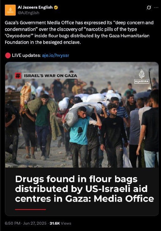 Власти Газы заявили об обнаружении наркотика в муке, которую получают палестинцы. В мешках с мукой из американо-израильских центров распределения найдены таблетки оксикодона с наркотическим эффектом, — приводит Al Jazeera сообщение властей. Администрация анклава в очередной раз потребовала закрыть эти центры, назвав их «ловушками смерти» из-за регулярных случаев обстрелов израильскими военными людей, пытающихся получить продовольствие.