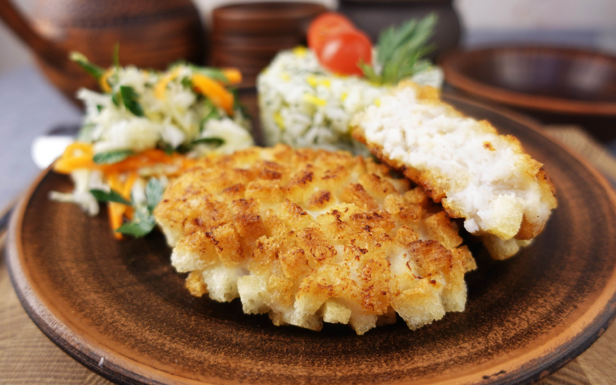 Руки смочить водой и сформировать овальные котлеты примерно по 70 г каждая, обвалять их в панировочных сухарях (кубики среднего размера).