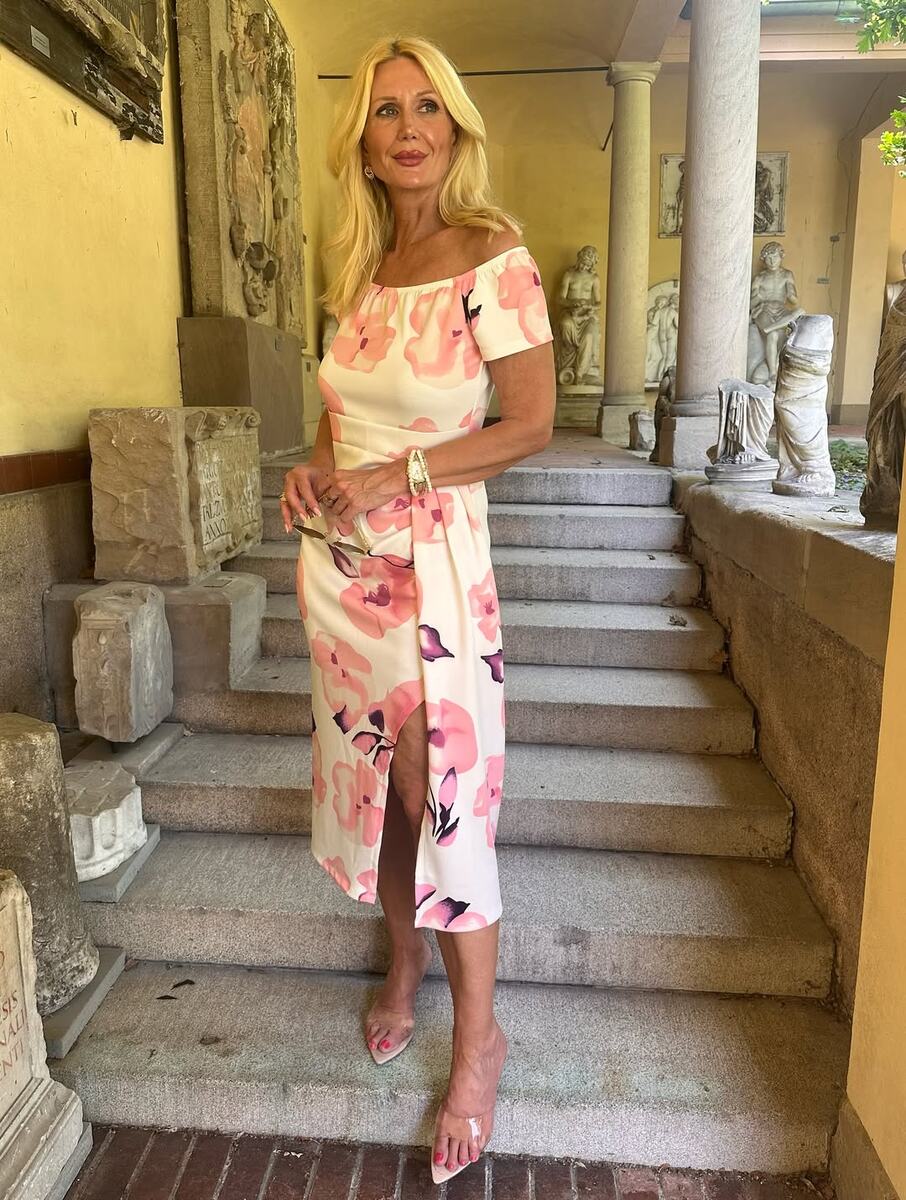 Посмотрите, как мягко работает это платье с открытыми плечами. Нежный фон плюс крупный акварельный рисунок придают образу лёгкость, а разрез по ноге делает его чуть смелее и раскованнее.