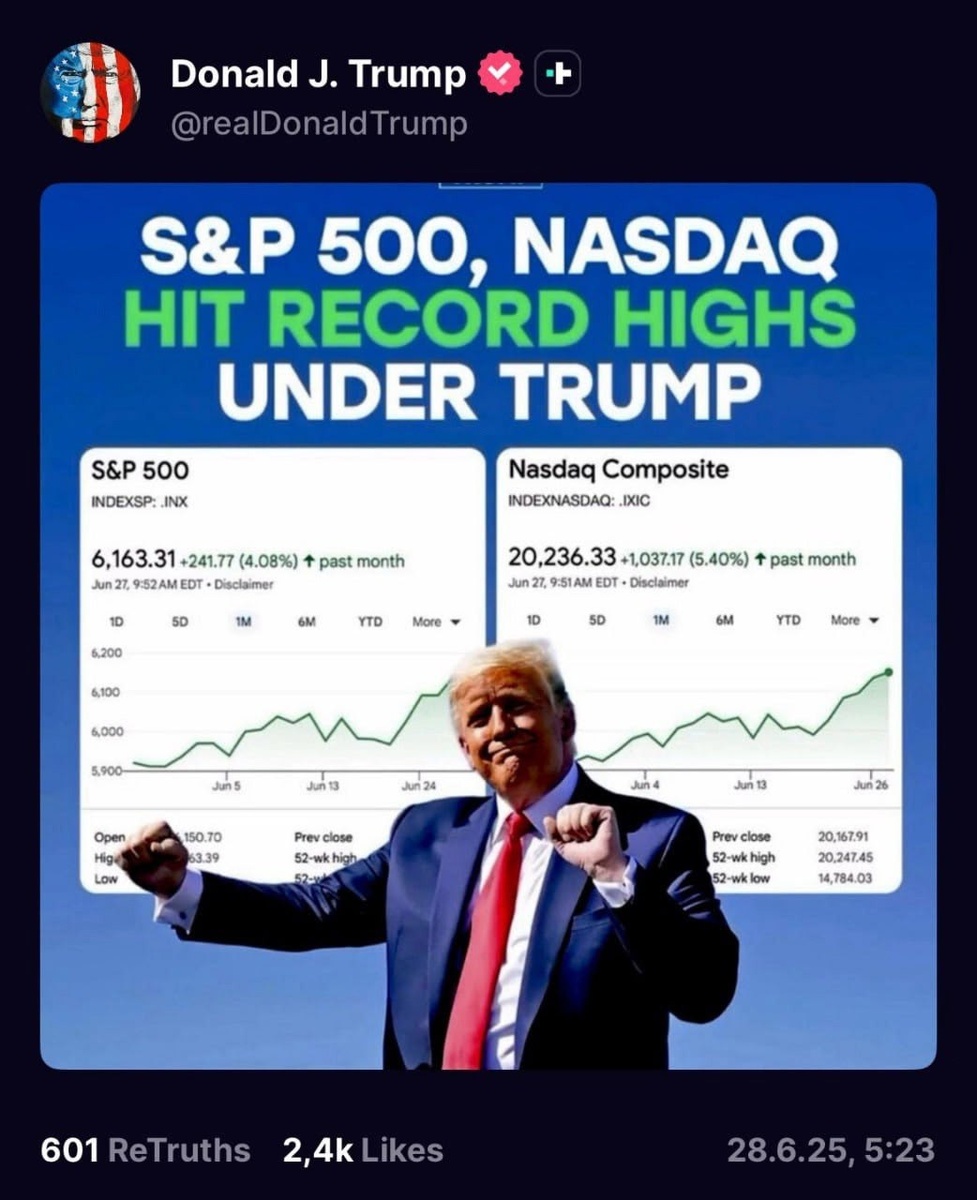 Трамп хвастается: S&P 500 и Nasdaq обновили ATH при его президенстве 😤
