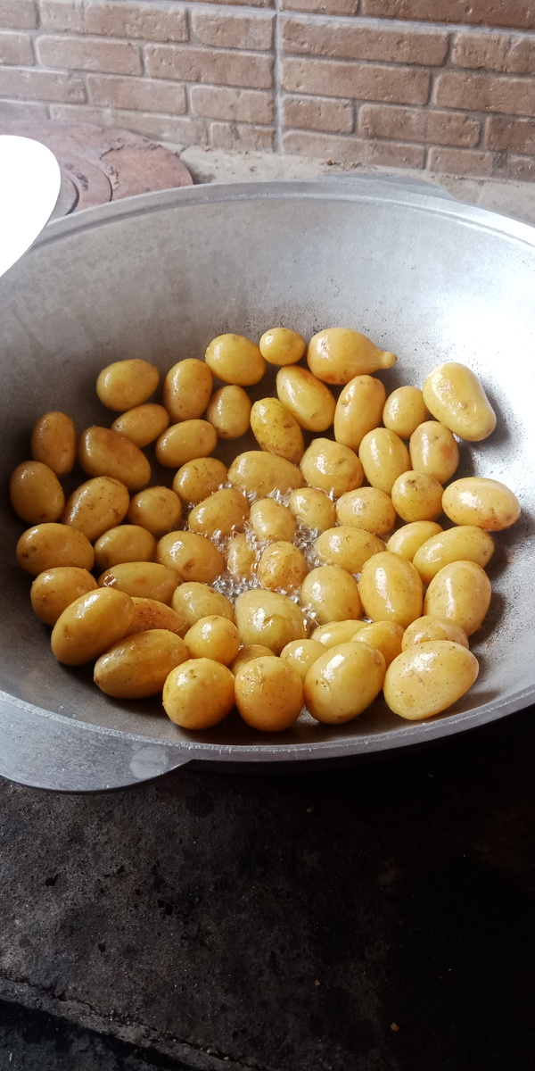 Самый незамысловатый, вкусный и быстрый рецепт картофеля, для тех кто любит готовить в казане на природе. Можно и дома в казане приготовить, но атмосфера согласитесь уже будет не та😊. Попробуйте приготовить это замечательное угощение и насладитесь гастрономическим опытом вместе с семьей или друзьями. Ингредиенты: Молодой маленький картофель – 3 кг. Соль – по вкусу Перец черный молотый – 1 чайная ложка Масло растительное – 200 мл. (можно и больше) Приготовление: Картофель тщательно промыть и удалить глазки, чистить не надо. Картофель желательно слегка промокнуть от влаги (это можно сделать при помощи бумажных полотенец или салфеток) Накаляем казан, вливаем растительное масло, ждем пару минут, чтобы оно хорошо прогрелось. Затем добавляем картофель, и не отходя далеко от казана, периодически его перемешиваем. Готовим минут 20-25, готовность проверить можно при помощи вилки или ножа. За пять минут до конца готовки добавляем соль и перец. Подаем сразу горячим из казана. Такой картофель от