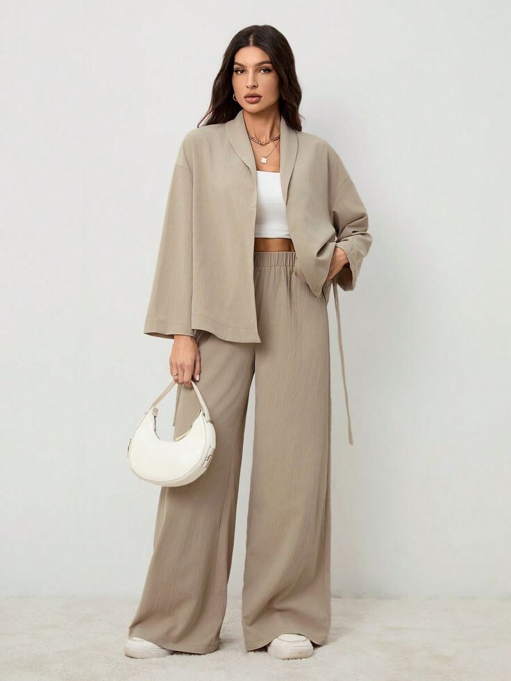 Если хочется уйти от джинсов в сторону более выразительного и воздушного силуэта, попробуйте палаццо. Их высокая посадка и свободные штанины визуально вытягивают ноги и делают фигуру гармоничнее.