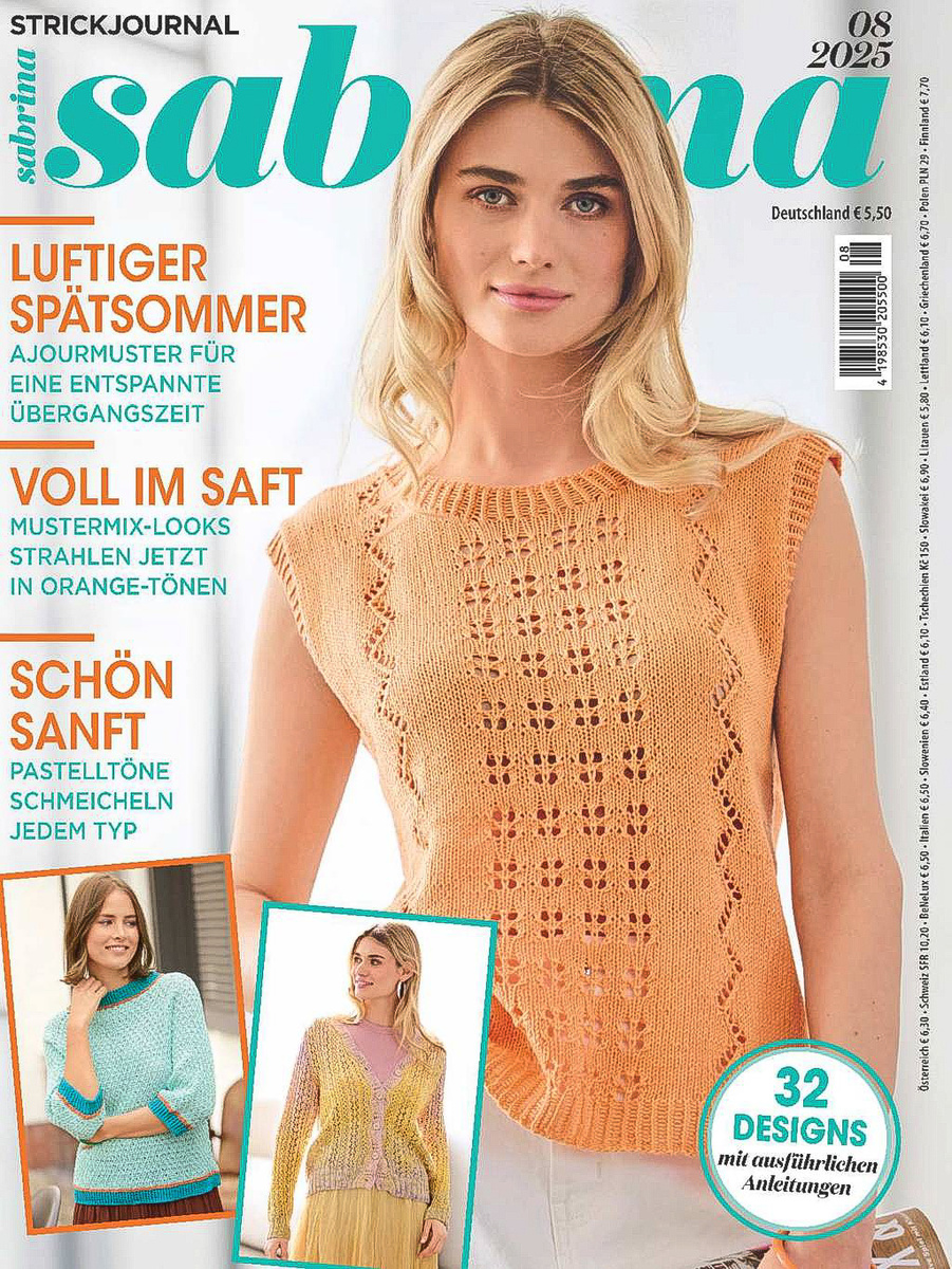 У кого-то сейчас в самом разгаре дачный сезон, кто-то только достал летнюю пряжу, а кто-то уже думает, что бы такое связать впрок. Журналы, как всегда, выходят с упреждением — и это логично. Тем более вязание не терпит спешки: даже простая безрукавка может растянуться на недели, а то и на месяцы. У меня такое бывает и нередко. Свяжу часть изделия — и всё, нужно, чтобы отлежалось. Причём неважно, на каком этапе остановилась. Просто нужно время, чтобы понять, нравится ли проект, хочется ли довязывать или лучше распустить. Несмотря на то, что на календаре разгар лета, вязальные предпочтения начинают постепенно меняться. В голове у многих уже появляются мысли о более тёплых вещах. И вот уже можно полистать новый выпуск Сабрины, здесь мы снова видим типичный формат журнала: много моделей, простая подача, довольно спокойный подход к дизайну. Всего в номере — 32 модели, среди них есть плечевые изделия, аксессуары, немного идей на грани между летом и осенью. Главный акцент — на простоту и у
