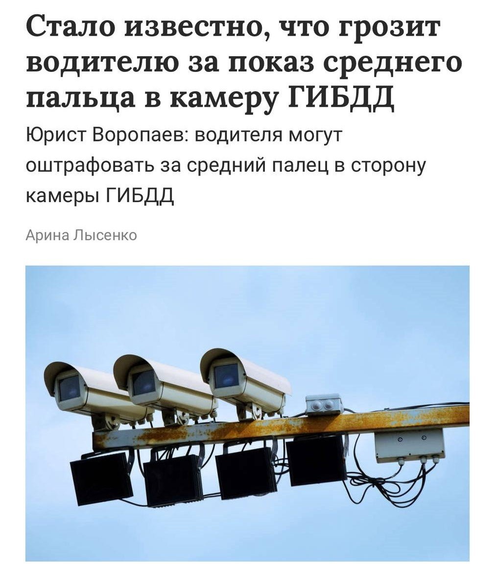 Показал камере средний палец? Готовься к 15 суткам: как жест может обернуться арестом Казалось бы, безобидный жест в адрес дорожной камеры может привести к реальному административному делу. Юристы предупреждают: в России за такой эмоциональный порыв можно схлопотать до 15 суток ареста или штраф. Почему это вообще наказуемо? - Мелкое хулиганство (ст. 20.1 КоАП) — если жест сочтут «нарушением общественного порядка». - Оскорбление власти (ст. 319 УК РФ) — крайний случай, но теоретически возможно, если инспектор усмотрит «презрение к госоргану». Что грозит на практике? - Штраф — до 1000 ₽. - Арест — до 15 суток (если усмотрят злой умысел или повторность). Стоит ли рисковать? Камеры фиксируют не только номера, но и действия водителя. Даже если вам кажется, что это «просто шутка», правоохранительные органы могут воспринять её иначе. А вы сталкивались с такими случаями? Делитесь в комментариях — обсудим, насколько это справедливо! Подписывайтесь на канал и ставьте уведом