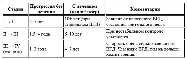 Здравствуйте! Есть ли какая-то статистика сколько времени +- (с лечением и без) проходит от 1 стадии до 2. Со 2 до 3ст. и до полной слепоты?