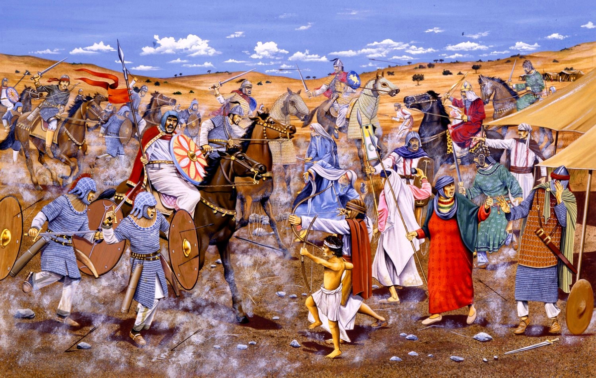 Император Ираклий собрал значительное войско для защиты Сирии, но оно было разбито арабами летом 633 г. близ Дамаска; новое войско, состоявшее из 80 тыс., встретилось с арабами на р. Ярмук, в небольшом расстоянии от Тивериадского оз. Здесь арабам в первый раз предстояло сразиться с многочисленной и организованной армией, и здесь в особенности могло иметь гибельные последствия соперничество между вождями. Халид ибн Саид, превосходя других умом и храбростью и понимая важное значение предстоящих событий, убеждал своих товарищей пожертвовать личным самолюбием и подчиниться начальству того, кто будет избран на то общим голосом. Вожди согласились избрать эмиром Халида и выполнили тот план сражения, какой им был предложен. Битва при Ярмуке была одной из самых кровопролитных в истории арабских войн. Три раза мусульмане должны были отступать перед натиском византийской конницы и снова вступать в бой, т. к. стоявшие сзади жены не допускали их до беспорядочного бегства. Наконец Халиду удалось отрезать неприятельскую конницу от пехоты и ударить всеми силами на византийский лагерь, расположенный между рекой и близлежащими горами. Поражение христиан было полное, ибо часть потонула в реке, другая часть погибла от меча мусульман. Одержанной при Ярмуке победой арабы обеспечили за собой успех последующего завоевания Сирии.