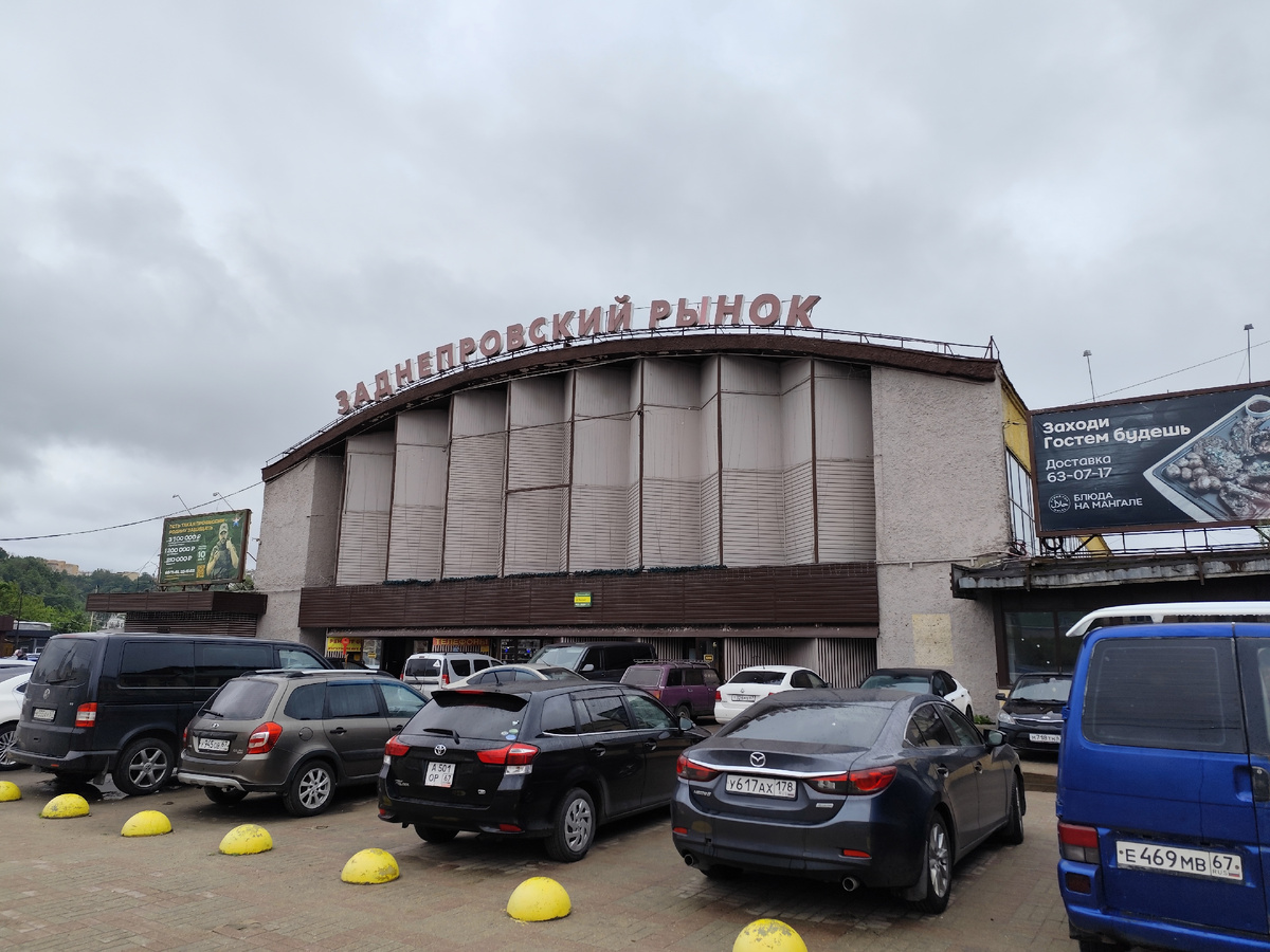 Встретил меня Смоленск весьма неласково - низким небом и мелким дождиком. Пейзаж Заднепровья вторил этой безрадостной погоде разбитым асфальтом, лужами, мусором, старыми трамваями на горбатых рельсах. Здесь же находится Заднепровский рынок, буквально погружающий в атмосферу "святых 90-х":