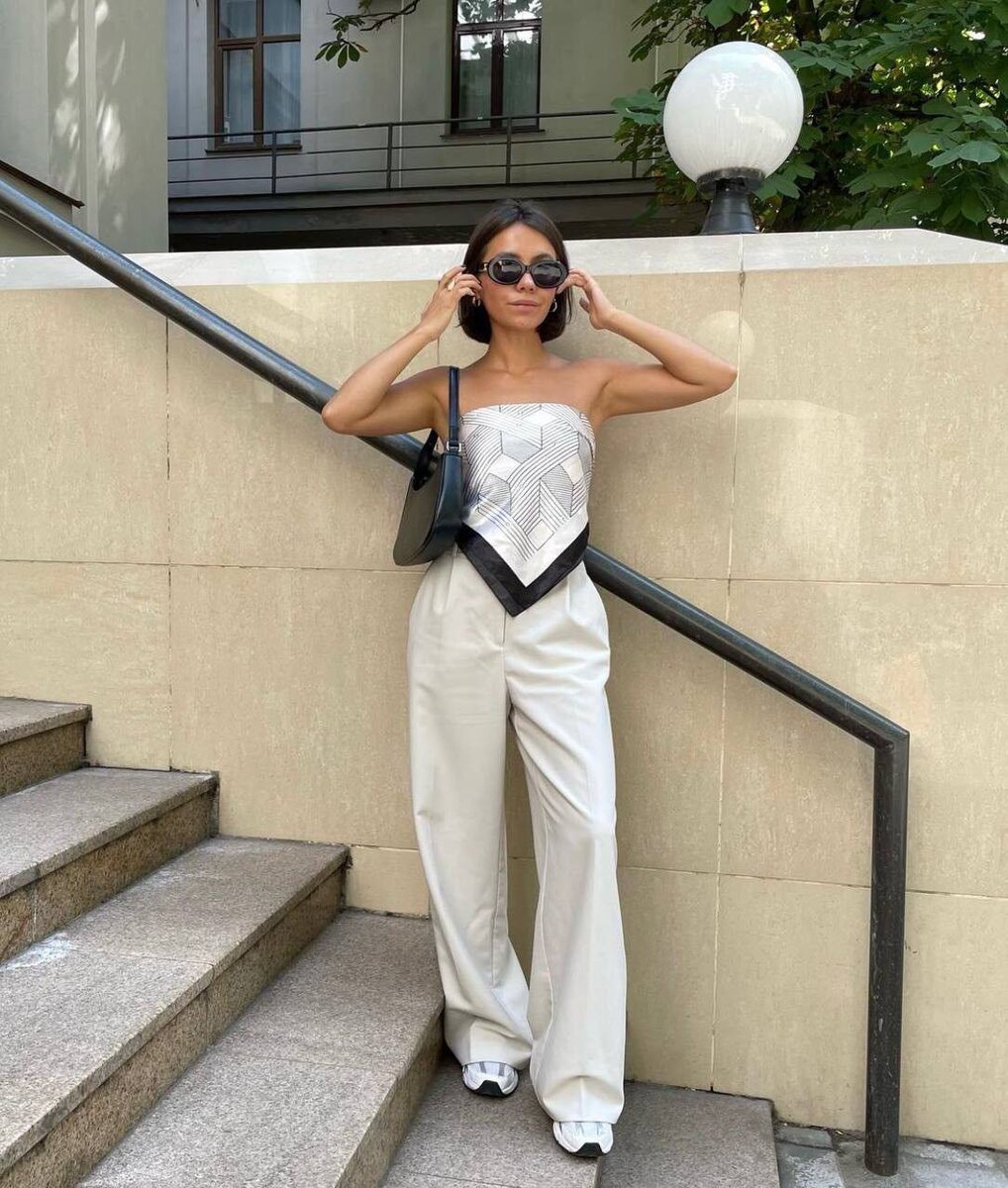 Носим как топ на голое тело или вторым слоем на футболку/рубашку, подчеркиваем талию или выбираем более классический вариант носки — на голове
