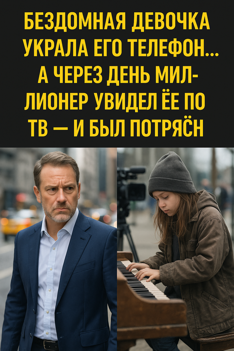 Бездомная девочка украла его телефон… А через день миллионер увидел её по ТВ — и был потрясён На людной улице Нью-Йорка, где каждый спешит по своим делам, миллионер Алекс Райнер вышел из своего чёрного внедорожника, чтобы купить кофе в маленькой уличной кофейне. В этот момент он и не заметил, как к нему тихо подошла худенькая девочка лет 12–13 в поношенной одежде. В считанные секунды она вытащила его телефон из кармана и растворилась в толпе. Алекс заметил пропажу лишь через несколько минут, и, хотя был раздражён, не стал устраивать панику. Он знал — телефон можно купить новый, но было что-то в этом странном исчезновении, что не давало ему покоя. На следующий вечер, вернувшись домой, он включил телевизор и, переключая каналы, случайно наткнулся на репортаж с городской ярмарки благотворительности. Камера показала уличную сцену: волонтёры раздавали еду и одежду бездомным. Среди них была она — та самая девочка. Только теперь она не крала. Она играла на старом пианино, которое кто-то ус