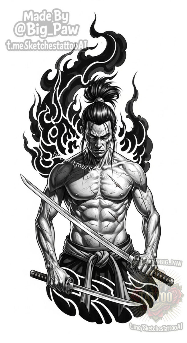 #2552 Подборка по запросу подписчика - эскиз Самурая в боевой стойке по пояс с катаной и танто,а за спиной чёрное пламя,можно брутал или хардкор