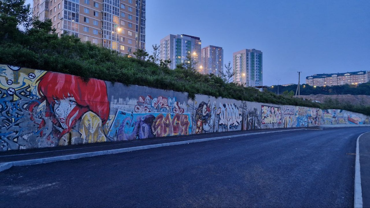 Граффити на Архангельской, которые были сделаны в 2023 году в рамках первого Дальневосточного фестиваля уличного искусства отлично смотрятся с новым асфальтом.
