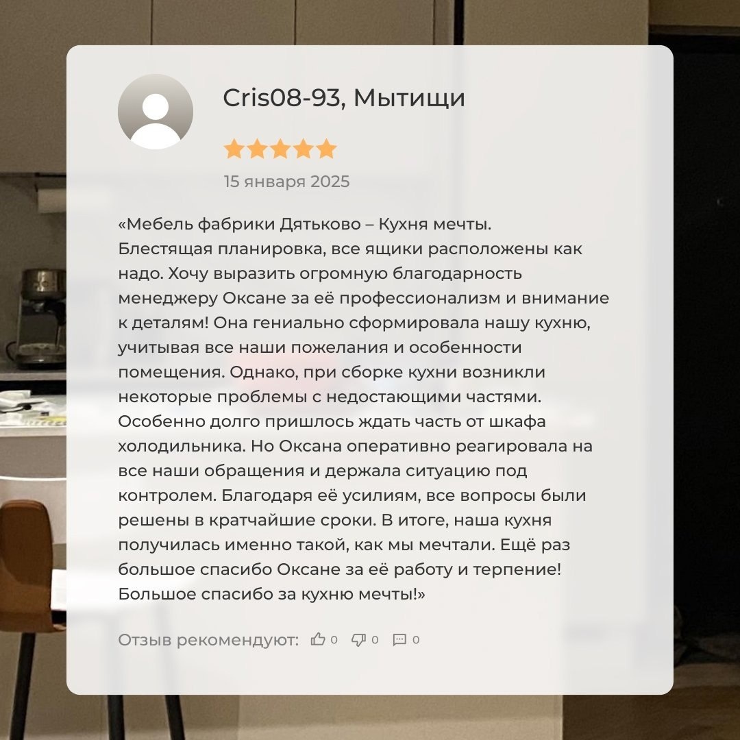 Делимся яркими эмоциями и впечатлениями наших любимых клиентов! 🌟 Рады представить вам отзывы владельцев новых, уютных интерьеров с мебелью Дятьково Design. Каждый отзыв – это частичка чьей-то счастливой жизни, которую мы бережно храним и которой нам очень хочется поделиться с вами.