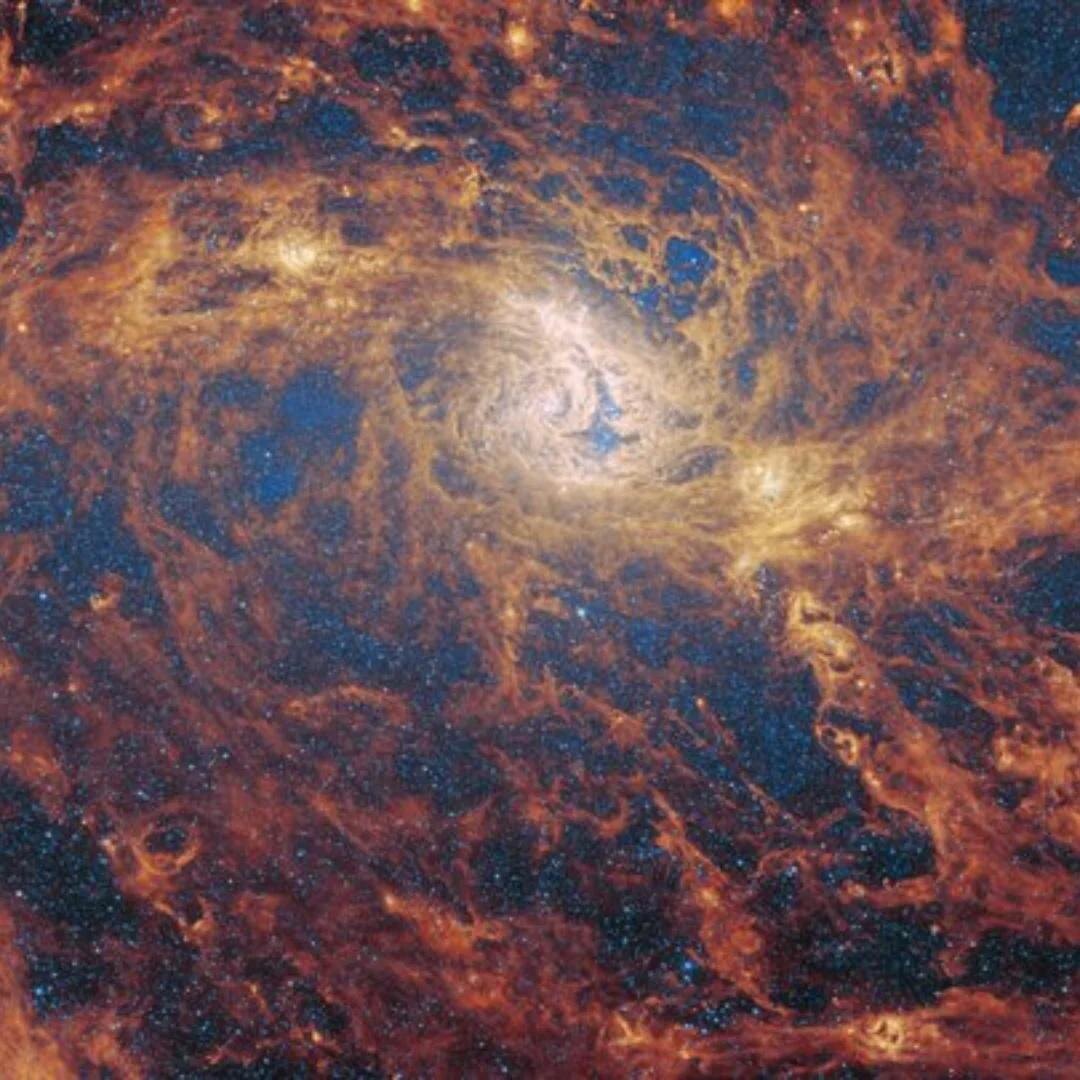 Это изображение, полученное с помощью инструмента MIRI на борту космического телескопа NASA/ESA/CSA "Джеймс Уэбб", использует всего два из десяти доступных фильтров. Ярко-синий цвет показывает распределение звезд в центральной части галактики, в то время как светящиеся желтые области, пронизывающие спиральные рукава, указывают на скопления активных звездных яслей. Оранжево-красные участки соответствуют важному классу углеродных соединений — полициклическим ароматическим углеводородам.