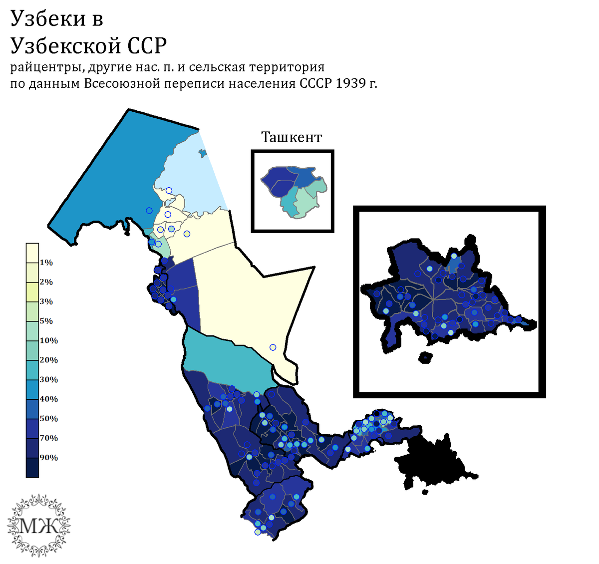 Ссылка на все ресурсы Оригиналы изображений с полным размером и до выхода статей доступны на Бусти Сегодня посмотрим на расселение трёх самых крупных этносов Узбекской ССР на 1939 год (в первой части можно увидеть общий план по всем этносам с большинством где-либо). И начнём естественным образом с самого крупнейшего из них - узбеков. На 1939 год в Узбекской ССР узбеков проживало 4081 тыс. человек, составляя 65,1% от общего населения, т. е. почти две трети населения. В целом, доля отзывается визуально, где мы видим разные смешанные зоны на основной территории компактного проживания узбеков. Западная же часть Узбекистана местами совсем не имела узбекского населения на тот момент. Из-за быстрого роста населения, а также притока населения из различных регионов РСФСР в города и рабочие посёлки, доля сельского узбекского населения была на высоком уровне - 85,6%. В этом отношении, среди тройки обозреваемых, узбеки были самым сельским этносом республики. Это хорошо видно и по выделенным отдель