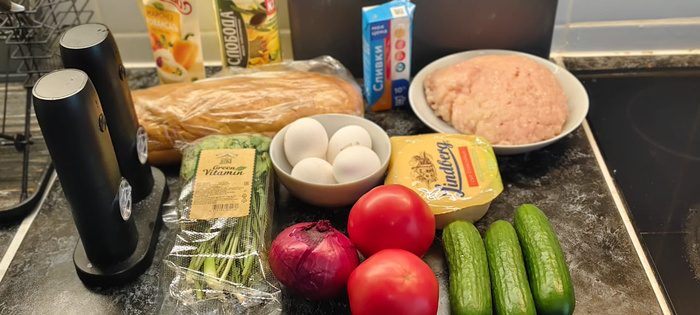 Зразы знаю. Но не делал. Первый эксперимент. Зразы если что, это такие котлеты с начинкой! Ну и салат с юшкой любят все. Мне в магазине редиска свежая попалась! Ингредиенты: Для зраз: куриный фарш, яйца, сыр, зелень, сливки, хлеб, соль перец, масло. Для салата: огурцы, помидоры, зелень, лук, майонез, соль перец. (редиску в кадр забыл добавить) Всем приятного аппетита! Подписаться на Пикабу Познавательный. и Пикабу: Истории из жизни.