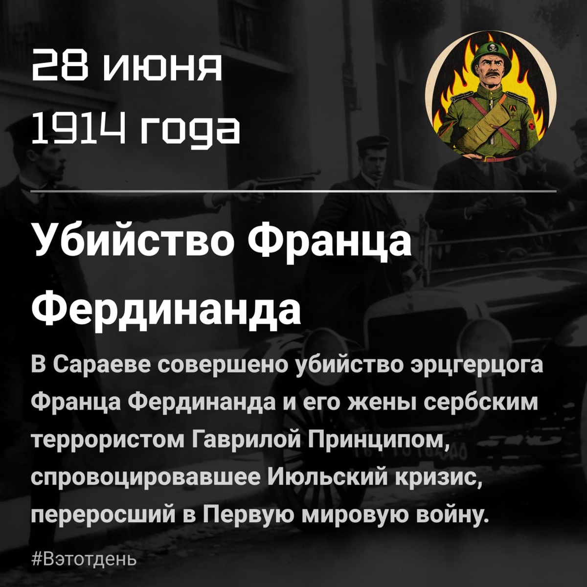 28 июня 1914 года в Сараеве сербский националист Гаврило Принцип, член группы «Млада Босна», смертельно ранил эрцгерцога Франца Фердинанда, наследника австро-венгерского престола, и его жену Софию. Сначала была попытка покушения, был брошен взрывной пакет, но он не сработал, и чуть позже Гаврило Принцип выстрелил в герцога в авто, когда тот остановился у Латинского моста по случайному стечению обстоятельств. Убийство стало последней искрой напряжённости в Балканах: уже через месяц Австро-Венгрия предъявила Сербии жёсткий ультиматум, а затем объявила войну — начался Июльский кризис и цепная реакция вступления великих держав в Первую мировую. #ВэтотДень@wwimemes