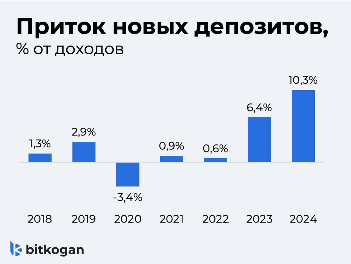 За последние 7 лет только в один год сняли с депозитов больше, чем принесли — в 2020 году, во время ковида. Там был идеальный шторм: низкие ставки (4,25% ключевая), кризис и локдауны. Люди буквально забирали деньги со счетов на жизнь, сидя без работы.
