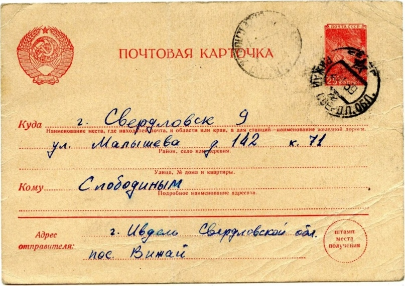 При этом, как мы знаем, вертухай Хакимов отправил машину с дятловцами из Вижая вовсе не до 41-го квартала, а до Второго Северного: об этом сообщил сам Хакимов в своем телефонном разговоре с Уфимцевым, об этом же говорится в "дневниках", и об этом же говорится в открытке Рустема Слободина, которую он отправил родителям из Вижая 26 января незадолго до выезда дятловцев из Вижая в 41-й квартал (см. Фото ниже).