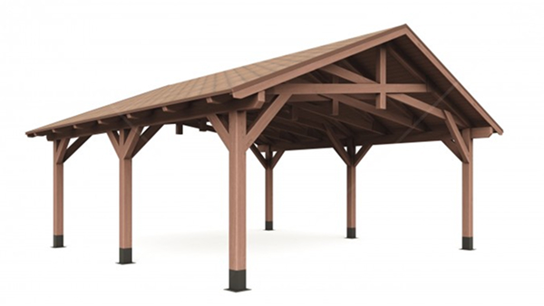 Навесы серии «Штутгарт» проектируются с учётом типовых ветровых и снеговых нагрузок для центральной части России, включая Московский регион. Конструкция базируется на клееном брусе стандартных сечений и металлических опорных стаканах. Двускатная крыша с фермами-ножницами обеспечивает жёсткость и равномерное распределение нагрузки без необходимости в дополнительных промежуточных опорах.