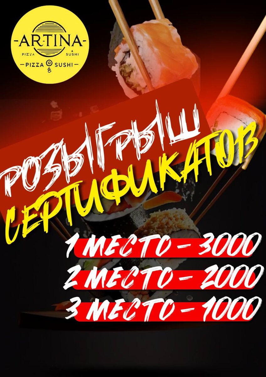 🎯 СЕГОДНЯ РОЗЫГРЫШ В ARTINA! 🎯 Дорогие друзья! Мы готовим для вас особенный розыгрыш с потрясающими призами! Наши призы: 1 место - сертификат на 3000 рублей 2 место - сертификат на 2000 рублей 3 место - сертификат на 1000 рублей Условия участия: 1. Подпишись на наш канал https://t.me/artinapizzasushi 2. Закажи СЕТ «ФИЛАДЕЛЬФИЯ»❤️ по самой ВКУСНОЙ цене 3. Поделись этим постом не менее, чем с 3 друзьями 4. Напиши «участвую» в комментариях к этому посту вместе с номером своего заказа 🎉 Победителей розыгрыша объявим 30 июня в прямом эфире Не упусти свой шанс стать победителем!