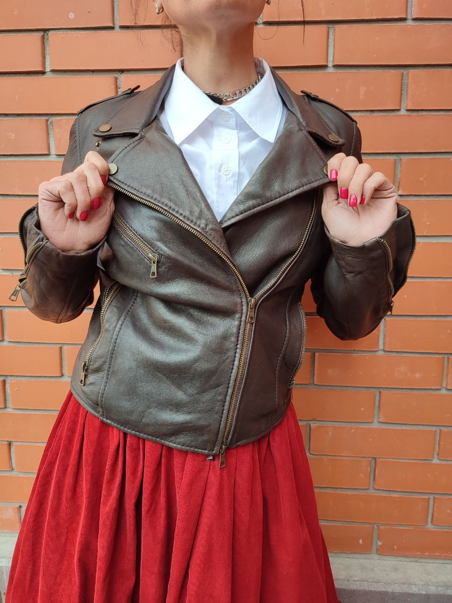 Недавно совершила потрясающую находку, которой не могу не поделиться! В одном из любимых секонд-хендов мне посчастливилось приобрести кожаную куртку-косуху от Zara. Изначально я зашла просто посмотреть, но эта вещь сразу же приковала мой взгляд. Первое, что бросилось в глаза – это качество кожи. Мягкая, эластичная, телячья кожа цвета горького шоколада выглядит просто роскошно. Этот оттенок идеально подходит практически ко всему, делая куртку универсальным элементом гардероба. Фурнитура под бронзу добавляет винтажного шарма и благородства. Дизайн куртки лаконичный, но продуманный до мелочей. Три наружных кармана – два боковых на молнии и один небольшой на кнопке – не только функциональны, но и добавляют куртке характер. Но самое главное – это посадка. Благодаря боковым резинкам куртка идеально садится по фигуре, подчеркивая силуэт и при этом не сковывая движений. Комфорт – это еще одно неоспоримое преимущество этой куртки. Она настолько удобна, что ощущается как вторая кожа. В не