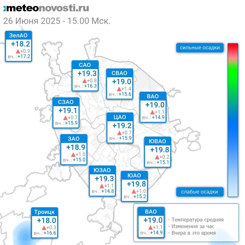В 15:00 в Москве было от +18°C до +20.6°C, средняя температура +19.3°C #погода #Москва #лето #температура #26июня #четверг