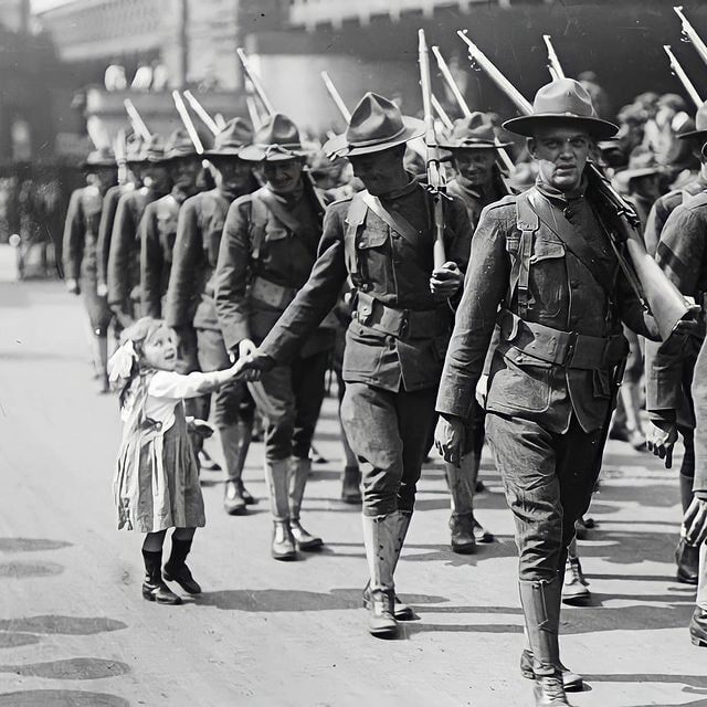 Американский солдат приветствует англичанку во время марша по Лондону, 15 августа 1917 года