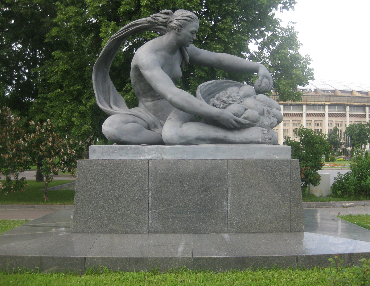 Начнем нашу прогулку по городу с Лужников, где в советское время были установлены две монументальные композиции, пожалуй, самого известного скульптора СССР – Веры Мухиной. Аллегорические скульптуры «Земля» (другое название – «Дары земли») и «Вода» («Дары воды» или «Море») были созданы по эскизам Мухиной и установлены уже после смерти мастера по разные стороны от Престижной аллеи Олимпийского комплекса, на Лужнецкой набережной. Первая, «Земля», изображает девушку, держащую в руках корзину с фруктами. Вторая, «Вода», представляет собой мужчину, удерживающего за плавник и хвост большого сома, а под ногами у него сидит краб. Обе скульптуры составляют единую композицию, не несут какой-либо идеологической нагрузки и просто служат отличным украшением набережной Москвы-реки.