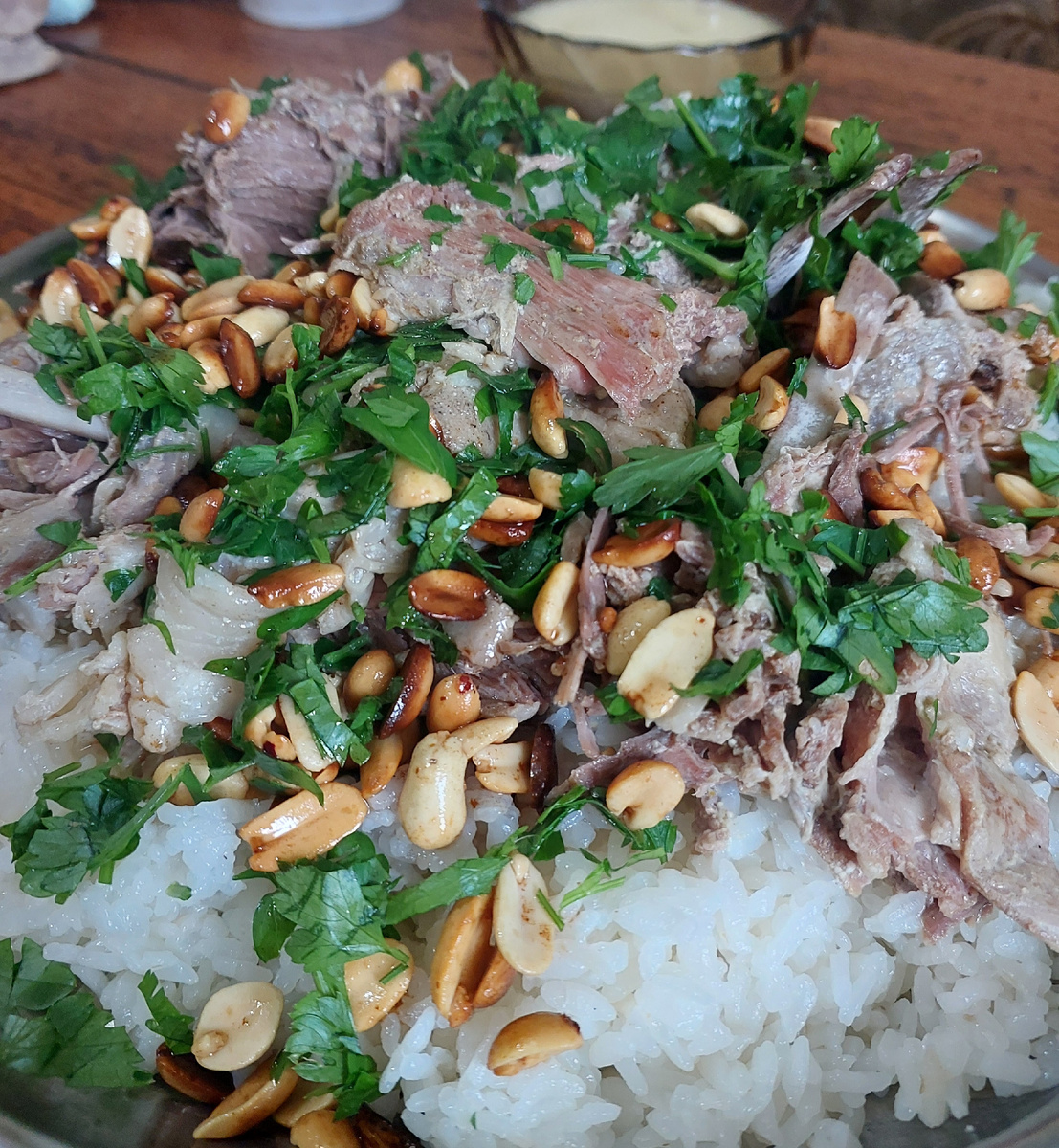 🌿 На днях была в гостях у подруги — мы не виделись сто лет, и вот наконец выбралась. Подруга жила какое-то время в Иордании и, конечно, угостила меня настоящим мансафом — это традиционное арабское блюдо, которое считается символом гостеприимства и щедрости. Делюсь с вами — вдруг тоже захочется устроить себе путешествие на Ближний Восток не выходя из кухни. 🍽 Что нужно: 🔖Баранина — около 1 кг 🔖Рис — 2 стакана 🔖Арахис — по вкусу 🔖Специи - черный перец, чеснок 🔖Лук — 1 головка 🔖Петрушка, лук зелёный (для украшения) 🔖Джамид (сухой йогурт) — около 100–120 г (предварительно размачивается и разводится в бульоне) 🟡 Но если джамид достать сложно (а у нас он почти не встречается), можно заменить его: 🔖 натуральным йогуртом (400–500 г), или 🔖 смешать йогурт и сметану примерно в равных частях — так получится более густой и насыщенный соус. 🍽 Как готовить: 1️⃣ Мясо отварите с луком до мягкости (примерно час-полтора). Не солите!!! Можно добавить чёрный молотый перец, чеснок. 2️⃣