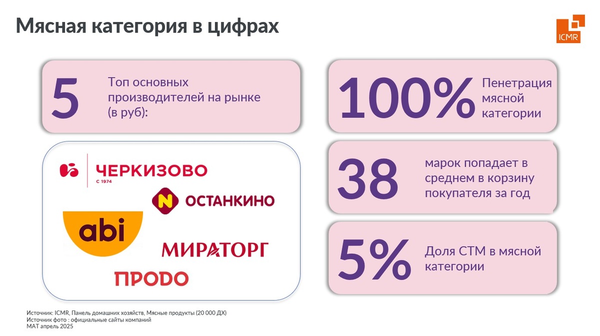 Высокая пенетрация мясной категории (практически 100%) подтверждает, что россияне — мясоеды. В среднем, в течение года покупатели приобретают продукцию 38 различных марок, что свидетельствует о высокой конкуренции в категории. И доля СТМ (собственных торговых марок) сейчас составляет 5%. В стоимостном выражении товарооборот мясной категории увеличивается за счет роста средней цены за килограмм (+10%). Частота покупок растет не так быстро, как в сегменте FMCG (товаров повседневного спроса) в целом. По данным исследования ICMR, за период апрель 2024 года - апрель 2025 года, в пятерку ведущих производителей мясной продукции входят “Черкизово”, “Останкино”, “Abi”, “Мираторг” и “Продо”.