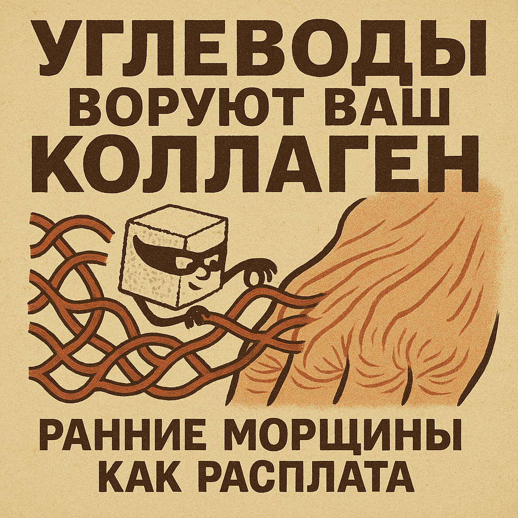 Коллаген — упругий пространственный каркас, на котором покоится кожа, связки, стенки сосудов и даже внутренний лоск хрящей. Пока этот каркас гибок и густ, лицо играет бликами молодости: свет легко отражается от плотных, ровно натянутых волокон; контур остаётся чётким, а поры — едва заметными. Но едва в привычный рацион начинает поступать постоянный поток крахмала, сахара и «безобидных» медовых гранул, структура меняется. Углеводы поднимают глюкозу, та приливает к коллагену и, словно клей, схватывает свободные аминогруппы. Если сладость на ложке варенья растворяется мгновенно, то сладость, осевшая на белке, держится годами и превращает его в уродливый хрупкий шнур. Морщины, что появляются к тридцати или даже двадцати пяти, — это не хроника календаря; это прямой счёт за каждую чашку подслащённого кофе, каждую тарелку пасты «на ужин, чтобы не нагружать желудок».