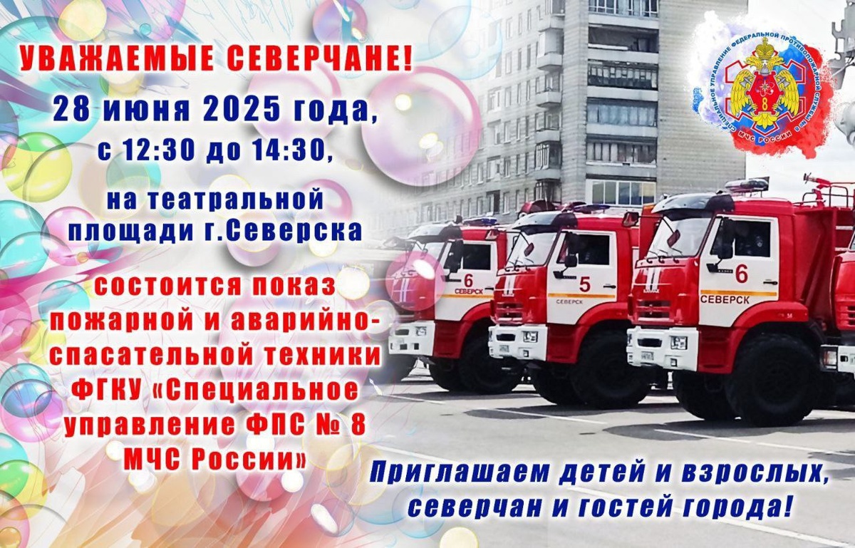 28 июня с 13:30 до 14:30 на театральной площади состоится показ пожарной и аварийно-спасательной техники. #СеверскАфиша