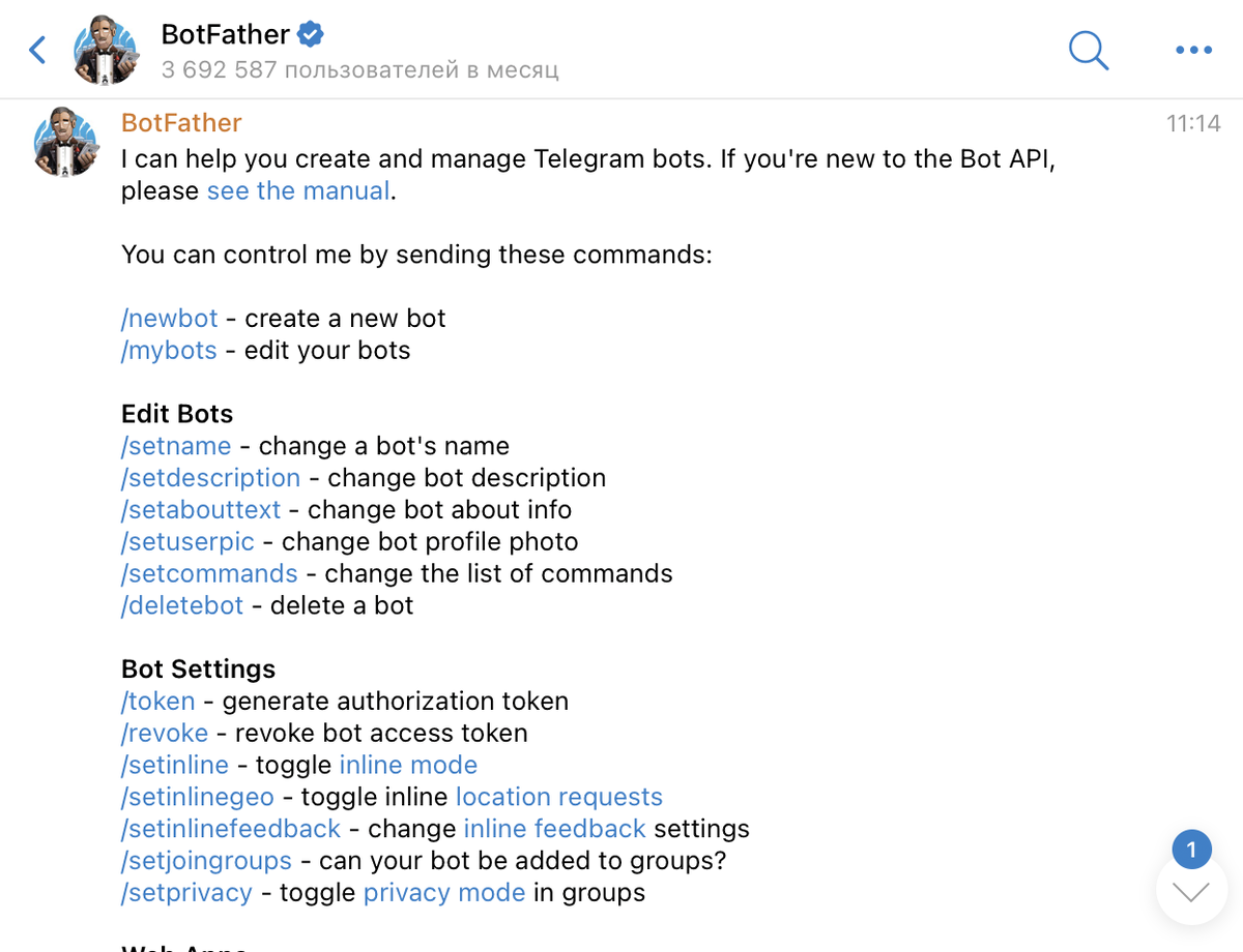 Придумайте название для вашего бота. Это может быть любое имя на русском или английском языке. Например: "Салон маникюра Афродита" или "Beauty nails". Это имя увидят все пользователи, и его можно будет изменить позже. Шаг 2: Username бота Теперь нужно создать уникальный username — адрес, по которому люди будут находить вашего бота. Важные правила: После успешного создания бота Father Bot выдаст вам токен — специальный код доступа. Это самый важный элемент безопасности! Вы можете добавить описание для бота, изображение на аватарку приветственное сообщение при запуске бота в разделе Edit Bot Создав бота вы можете наделить его особыми функциями, будь то управление группой или каналом, так и создание он