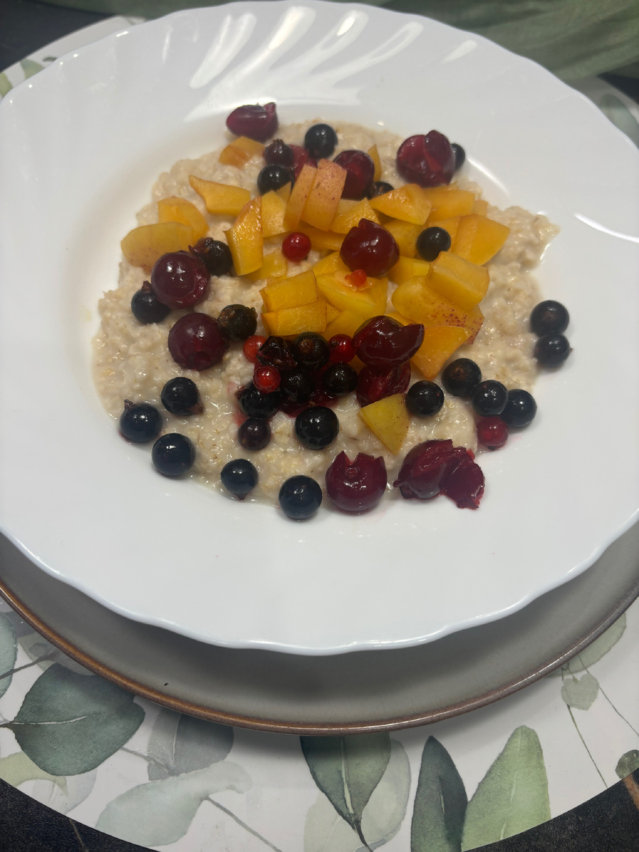 каша овсяная на воде с вишней, смородиной и абрикосом в сезон ягод мы обожаем такое блюдо Яичница с охотничьими колбасками быстро и просто в приготовлении: обжарить колбаски, разбить яйцо, соль и приправы по вкусу снова овсяная каша на воде, только в этот раз с малиной в этот раз я даже не поленилась засервировать стол овсяная каша с малиной и смородиной что - то вроде шаурмы в половину круглой лепешки положила майонез, томат, морковь корейскую и запеченую курицу. Красиво закрыла, погрела на гриле минуту Солянка со сметаной за 30 минут в воду забросила кубик говяжий ( лень было варить бульон), картошку, охотничьи колбаски, копченое мясо, томатную пасту. Через 15 минут после закипания добавила натертые огурцы, оливки, базилик. Через 5 минут после закипания выключила Еще была окрошка, ее не фотографировала макароны с фаршем цвет конечно оставляет желать лучшего, но готовила из того, что нашла: остатки фарша от ленивых голубцов (свинина, курица, лук, капуста), приправы, соль, потуш