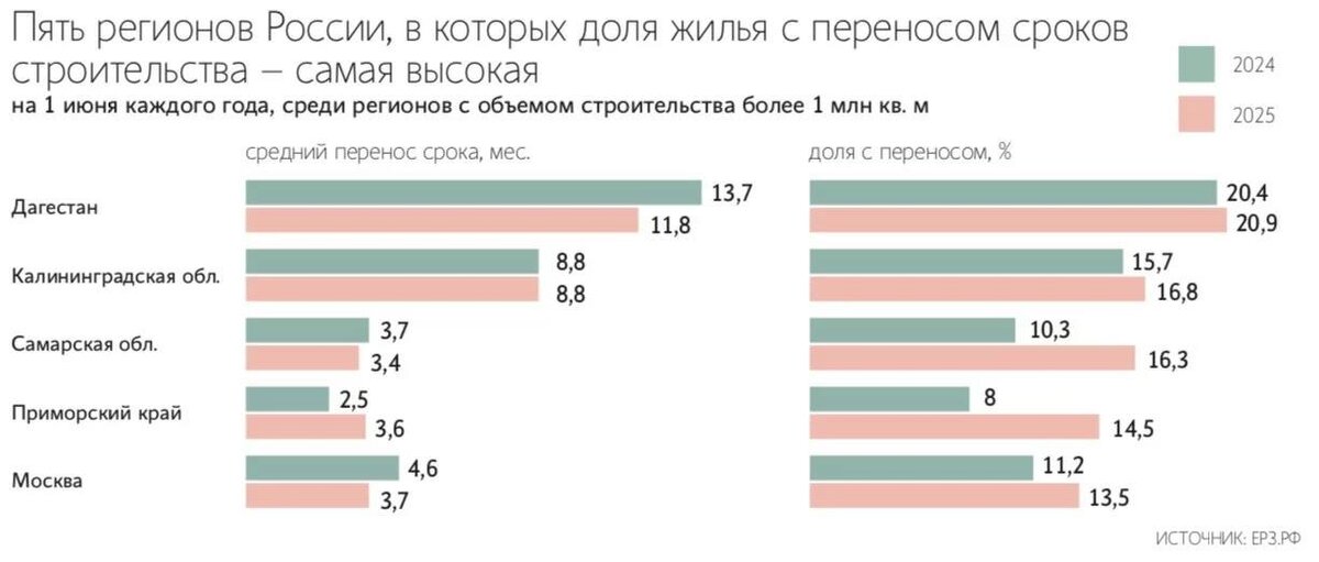 Годом ранее, по его данным, таких новостроек было на 1,2 млн м² меньше. Доля же таких проектов в общем объеме строительства с того момента выросла с 8,4 до 10% • В настоящее время среди регионов с большими объемами строительства максимальную долю строящегося жилья с просроченным вводом ЕРЗ фиксирует в Дагестане (20,9%), Калининградской области (16,8%), Самарской области (16,3%)