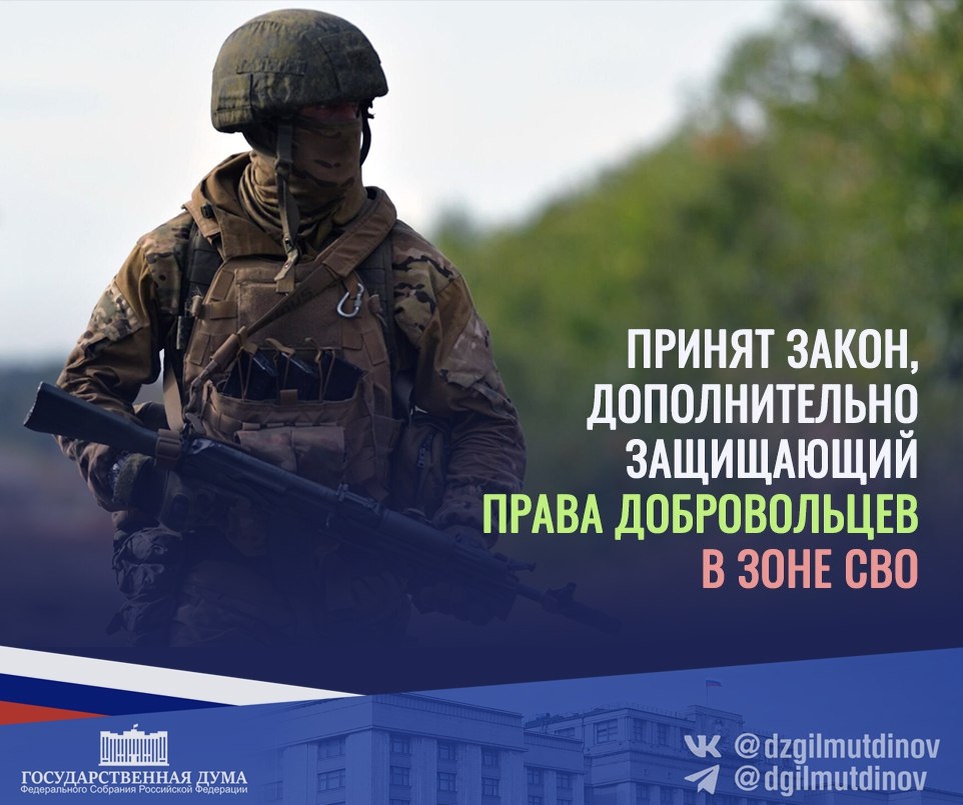 Приняли в третьем чтении закон о праве командиров воинских частей удостоверять доверенности и завещания добровольцев, а также подписи бойцов в заявлениях об определении опекуна или попечителя ребенку на случай смерти бойца. Это обеспечит возможность получения денежных выплат, оформления льгот, получения справок, совершения сделок и по другим важным для семьей добровольцев вопросам. Добровольцы рискуют жизнью. Бойцы не располагают возможностью визита к нотариусу, чтобы оформить доверенность, а этот закон чтобы представить его интересы в различных организациях и структурах. #динаргильмутдинов #Госдума #ЕдинаяРоссия ЕР Госдума восьмойсозыв