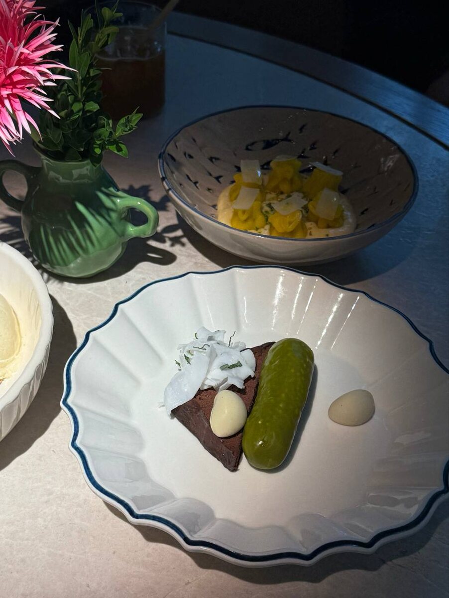 Если вы думаете, что это тост с салом, чесноком и маринованным огурчиком – не верьте. Очередной шедевр от бренд-шефов Виталия Истомина и Артема Лосева десерт-обманка найден в «Афине». На вид, как соленый вариант, а на вкус - крем маскарпоне с амаретто и мороженым.