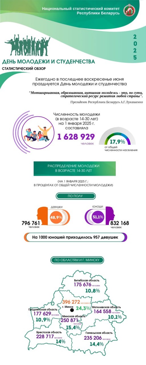 📊 Статистический обзор ко Дню молодежи ➡️ Основные демографические показатели молодежи (14-30 лет) на 1 января 2025 г.: ▪️Общая численность: 1,6 млн человек ▪️Доля в населении: 17.9% ▪️Распределение по полу: Юноши: 832 168 человек (51.1%), девушки: 796 761 человек (48.9%) ➡️ Выпуск квалифицированных рабочих и специалистов в 2024 г.: ▪️Квалифицированные рабочие (служащие): 21, 4 тыс. человек ▪️Специалистов со средним специальным образованием: 30,2 тыс. человек ▪️Специалистов с высшим образованием (диплом бакалавра/специалиста): 46,4 тыс. человек ▪️Специалистов с дипломом магистра: 7,3 тыс. человек ➡️Браки (2024 г.): Брачный союз заключили в возрасте до 31 года: ▪️Девушки: 26.2 тыс. ▪️Юноши: 22.9 тыс. Предпочитаемый возраст создания семьи: ▪️Девушки: 21-26 лет ▪️Юноши: 23-28 лет ➡️ Занятость молодежи (15-30 лет): ▪️Доля занятой молодежи (15-30 лет) в общем занятом населении (15-74 года): 17.6% Доля занятой молодежи (15-30 лет) в общей численности молодежи (15-30 лет): 55.3% ➡️ Топ-