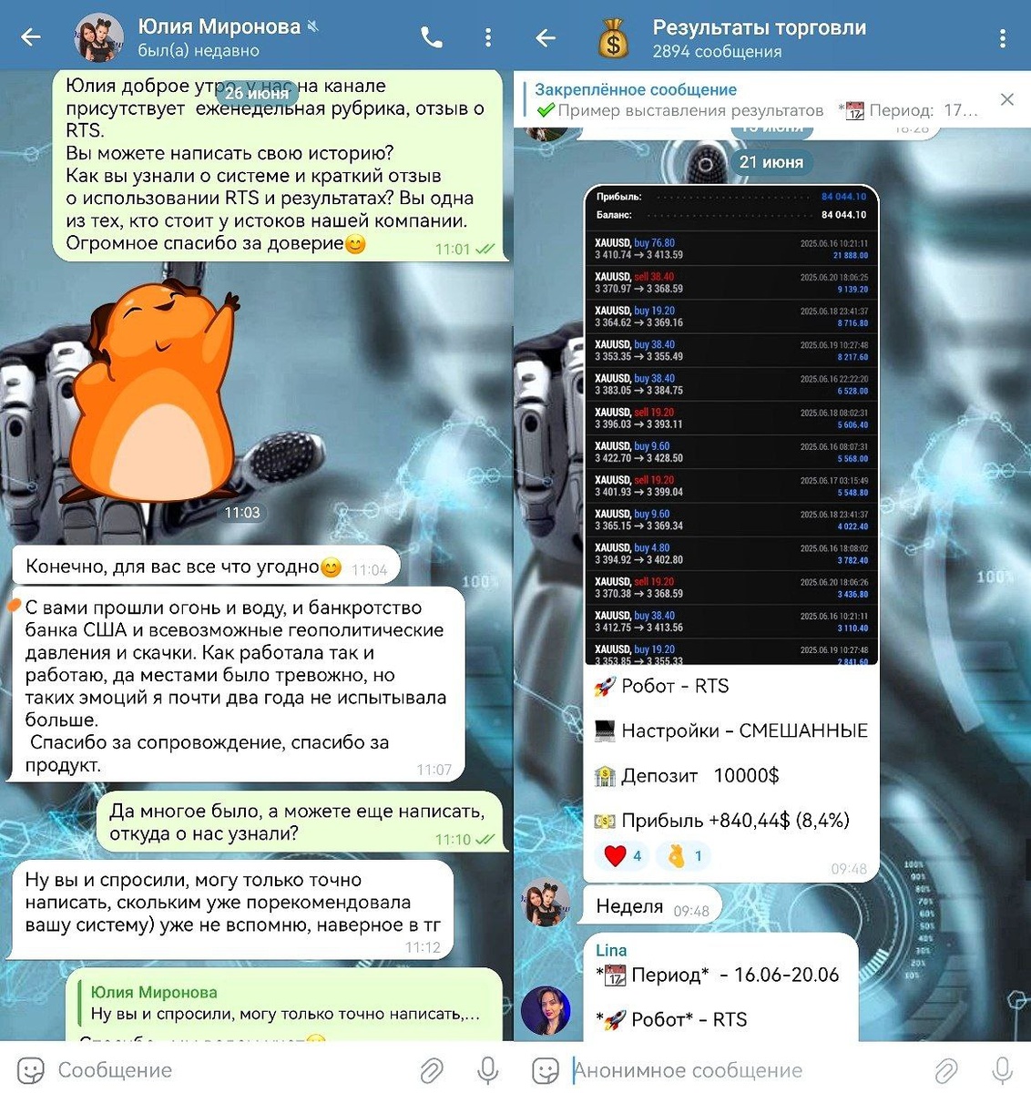 💬История Юлии: «С вами прошли огонь и воду» ВСЕ ОТЗЫВЫ ➡️ #отзывыRTS #RTS #отзывыRTS #историяпользователя #трейдинг #опыт Каждый четверг мы делимся историями пользователей RTS. Сегодня — Юлия , одна из первых, кто доверился системе. И осталась с нами, несмотря на все рыночные бури: С вами прошли огонь и воду, и банкротство банка в США, и всевозможные геополитические давления и скачки. Как работала, так и работаю. Да, местами было тревожно, но таких эмоций я почти два года не испытывала больше. Спасибо за сопровождение, спасибо за продукт. Юлия с нами с самого старта. Мы спросили, как она узнала о системе: Ну вы и спросили. Могу только точно сказать, скольким уже порекомендовала вашу систему :) Уже не вспомню, наверное, нашла в Telegram. Это и есть сила RTS — не просто результат, а стабильность. Когда трейдинг становится частью жизни. Когда не страшны ни новости, ни турбулентность. 🤝 Юлия, спасибо вам за доверие, за годы с нами и за то, что вы рядом. Такие истории напоминают,