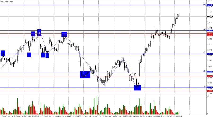 https://basechop.ru/wordpress/?p=48065 Добрый день, уважаемые трейдеры! На часовом графике пара GBP/USD в среду выполнила закрепление над зоной сопротивления 1,3611 – 1,3633 и продолжила процесс роста в направлении следующего уровня Фибо 200,0% – 1,3749. Отбой курса пары от этого уровня сработает в пользу валюты США и некоторого падения, но медведи на рынке вновь практически отсутствуют. Закрепление котировок британца над уровнем 1,3749 повысит вероятность продолжения роста в направлении следующего уровня коррекции 1,3937. Ситуация с волнами указывает на завершение «медвежьего» тренда, который длился буквально неделю. Последняя завершенная волна вниз пробила лоу предыдущей волны лишь на несколько пипсов, а новая волна вверх с легкостью пробила предыдущий пик. Трейдеры-медведи вновь спасаются бегством, так как конфликт на Ближнем Востоке быстро завершился, а факторов поддержки у доллара по-прежнему крайне мало. Торговая война Трампа продолжает оказывать разрушительное влияние на…